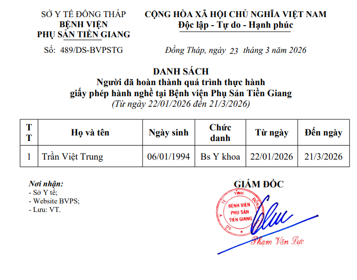 DANH SÁCH Người đã hoàn thành quá trình thực hành giấy phép hành nghề tại Bệnh viện Phụ Sản Tiền Giang (Từ ngày 22/01/2026 đến 21/3/2026)