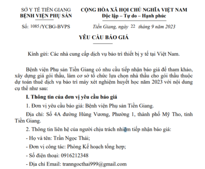 YÊU CẦU BÁO GIÁ Số: 1085/YCBG-BVPS ngày 22/9/2023 Bệnh viện Phụ sản Tiền Giang có nhu cầu tiếp nhận báo giá để tham khảo, xây dựng giá gói thầu, làm cơ sở tổ chức lựa chọn nhà thầu cho gói thầu thuộc dự toán thuê dịch vụ bảo trì máy xét nghiệm huyết học năm 2023
